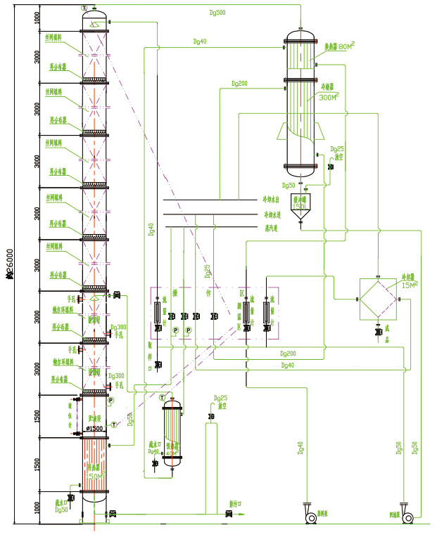 本裝置適用于制藥、食品、輕工、化工等行業(yè)的稀酒精回收。也適用于甲醇等其他溶煤的蒸餾。本裝置根據(jù)用戶的需要,可根據(jù)30℃左右的稀酒精蒸餾至90℃-95℃酒精,成品酒精度數(shù)要求再高,可以加大回流比,但產(chǎn)量就相應(yīng)減少。
